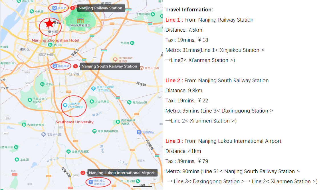 Travel Information: Nanjing Zhongshan Hotel can be reached by taxi or public transport from Nanjing Railway Station,Nanjing South Railway Station and Nanjing Lukou International Airport. Details are as follows: