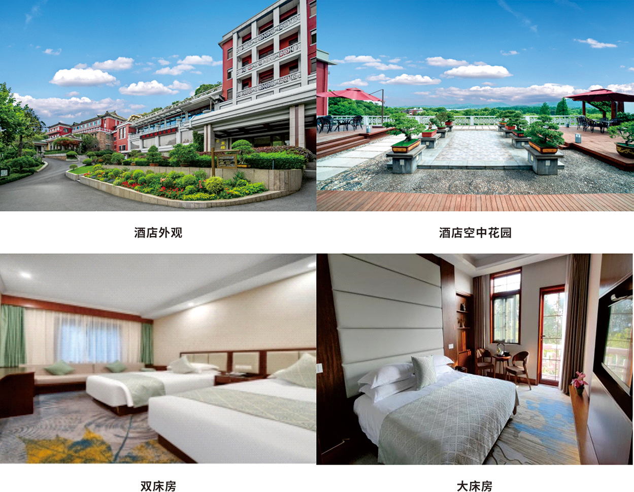 在五楼屋顶花园,驻足远眺,饭店与西子湖山自成一色,湖光倒影,群山叠翠,游船泛波,西湖美景尽收眼底;近观院内,墙红瓦绿,茂林修竹,喷泉轻舞,鸟鸣花艳,尽显华贵典雅。